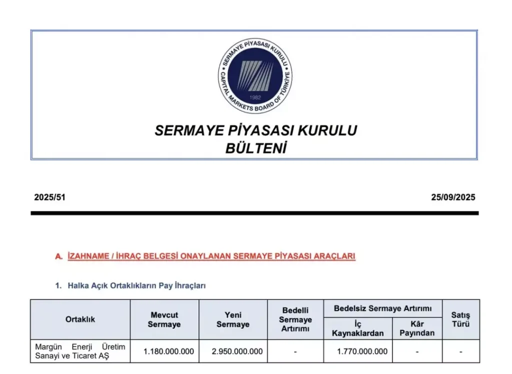 Sermaye Piyasası Kurulu (SPK), 25 Eylül 2025 tarihli haftalık bülteninde Margün Enerji Üretim Sanayi ve Ticaret A.Ş.’nin sermaye artırımı başvurusunu onayladı.