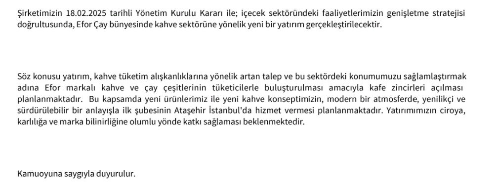 Efor Çay Yönetim Kurulu Başkanı İbrahim Akkuş, yakın zamanda Erbaa tesislerinde kahve üretimine başlayacaklarını duyurdu. Şirket, çay sektöründeki deneyimini kahve pazarına taşıyarak ürün yelpazesini genişletmeyi hedefliyor.